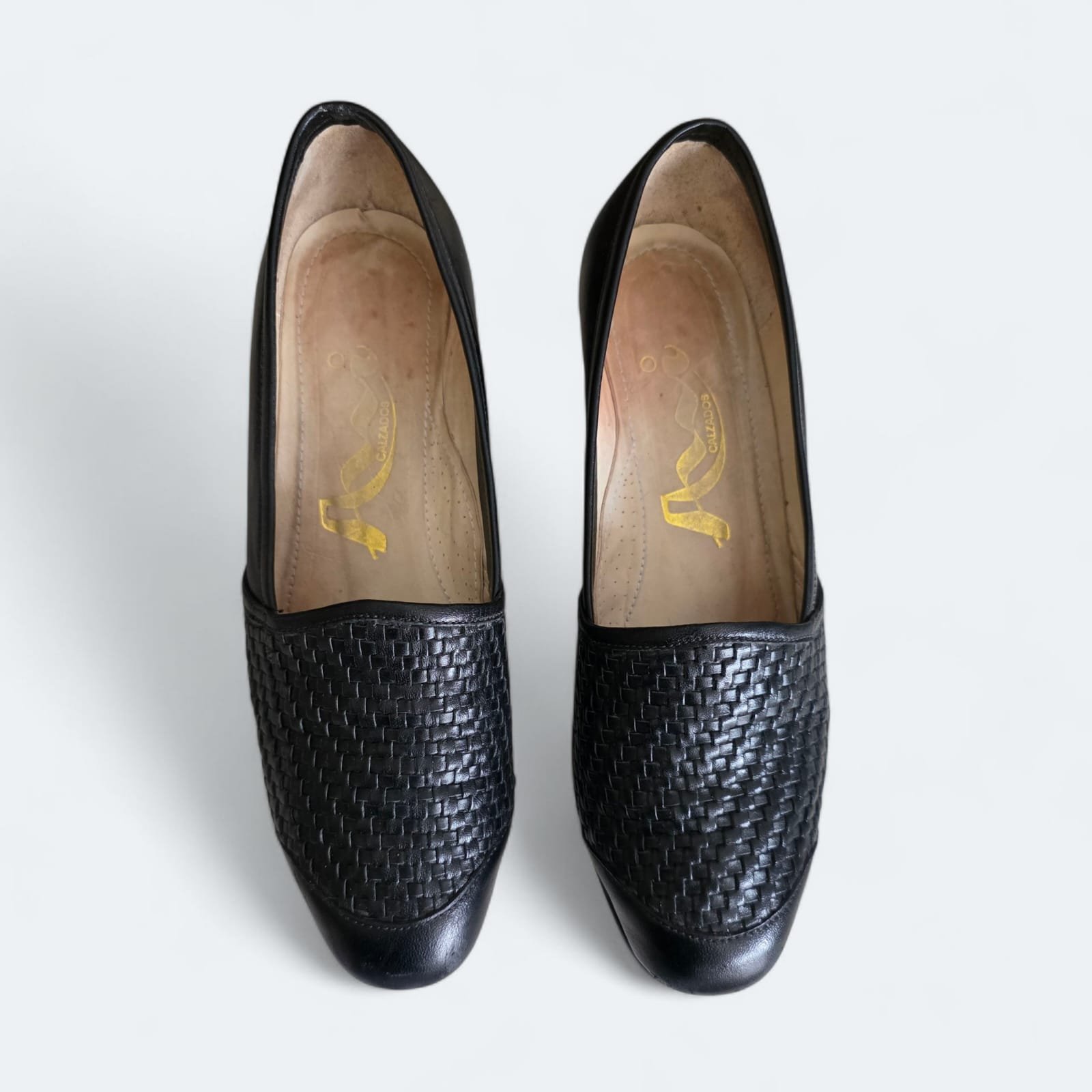 Material: Cuero negro de alta calidad, suave y resistente, con detalles de tejido trenzado en la parte frontal, que aportan un aspecto artesanal y refinado.