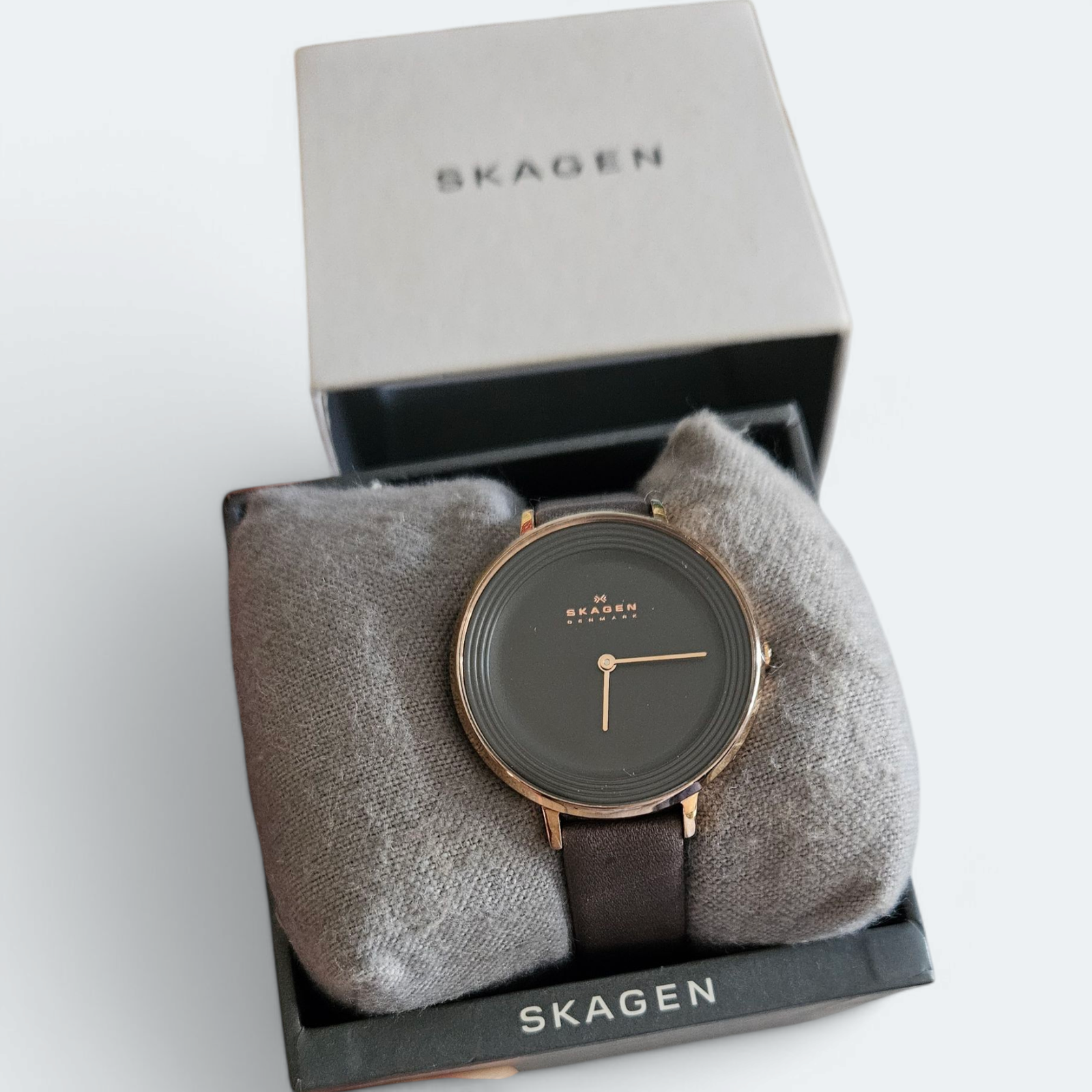 Este reloj Skagen combina la estética minimalista de la marca con una **malla de cuero** en perfecto estado, realzando su diseño elegante y moderno. Con **esfera de tono gris** y **acabados dorados**, ofrece un contraste sutil y sofisticado, ideal para cualquier ocasión.
